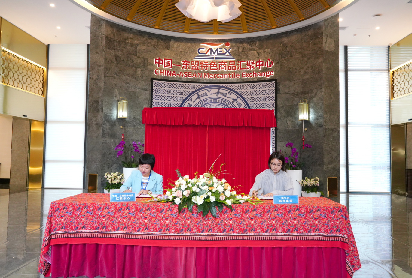 2023年10月10日,匯聚中心又吸引了南寧市第二中學(xué)、南寧市新民中學(xué)學(xué)生綜合實(shí)踐研學(xué)基地落戶(hù),并圓滿(mǎn)舉辦了簽約和揭牌儀式。南寧市第二中學(xué)校區副校長(cháng)曾晶、南寧市新民中學(xué)副校長(cháng)關(guān)雪、中國—東盟特色商品匯聚中心副總經(jīng)理盧春梅、中國—東盟特色商品匯聚中心副總經(jīng)理李丹共同出席儀式。